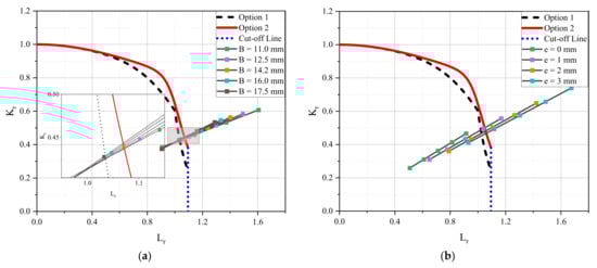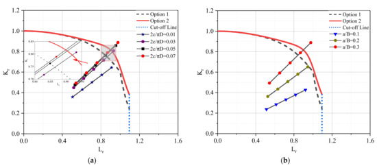Each option of the BS 7910 FAD method consists of an assessment curve, which is obtained by the curve equation Kr = f(Lr), and a cut-off value Lr,max. If the calculated rating point (Lr, Kr) is located within the area surrounded by the vertical line of the axis, the rating line, and the cut-off value Lr,max, then, the crack passes; if it is located outside that area, then, the crack fails. The cut-off value Lr,max is determined according to Equation (4), in which the average tensile strength is generally used. In this case, due to a lack of statistical data regarding the performance of the parent material, the minimum tensile strength of the X65 steel was used to calculate the cut-off value for conservative consideration.