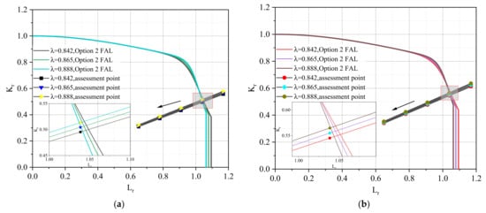 It can be observed that, the larger the level of misalignment, the lower the ultimate axial tensile load that the ring welded joint can withstand. According to the Option 1 evaluation, when the size of the crack is the smallest and the misalignment is 3 mm, the maximum axial load should not exceed 0.62 times the minimum yield strength. Under the same conditions and when the crack size is the largest, the maximum axial load should not exceed 0.51 times the minimum yield strength. For different crack sizes with respect to the depth ratio, the effect of the wall thickness on the axial load does not exhibit a completely consistent trend, which also indicates that the ultimate axial load that the girth weld can bear is the result of multi-factor comprehensive effects, and the effect of wall thickness alone is not significant.