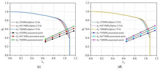 According to the results shown in Figure 10a,b, under the same tensile strength, the lower the yield strength, the higher the corresponding cutoff value, and the wider the envelope range of the failure assessment curve. The increase range is concentrated mainly in the plastic deformation area. In addition, the higher the yield strength, the higher the fracture ratio of the evaluation point, which indicates that a too high yield ratio is not conducive to pipeline safety.