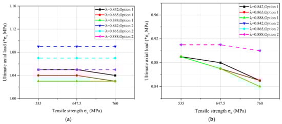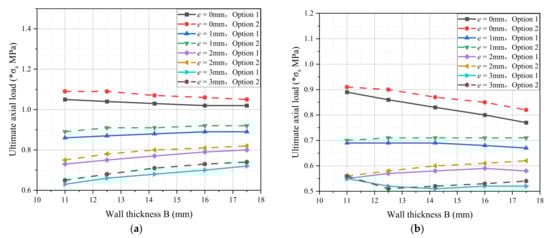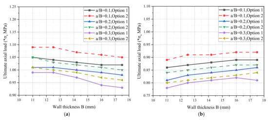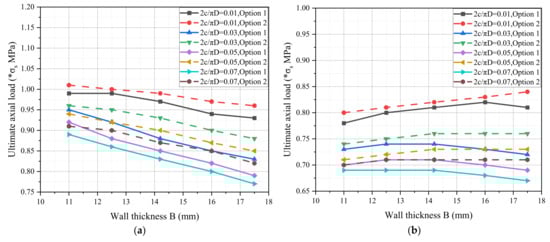 Ultimate axial load of girth weld cracks in pipes with different wall thickness values (a/B = 0.3). (a) e = 0 mm; (b) e = 1 mm.