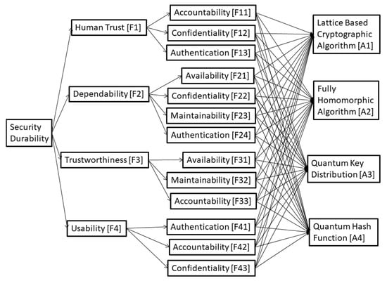 The fuzzy AHP procedure provides assessment and weighting of the security factors in the selected software security []. This quantitative research identifies practical threats or security factors of a product, and the strategy of the fuzzy AHP decides the distinct weight of the components. The exploration study has additionally embraced the symmetrical technique based on fuzzy AHP, for assessment and examination of the effect on the security durability of software. Software security uses the multi-standards dynamic methodology of FAHP for the assessment of usable security in programming. Security is the essential portion of software []. The upgrading of security and ease of use in programming is of foremost significance. The developers have to guarantee the precise evaluation of the software. Security and durability are concepts that mention convenience, with security of the product being a trade-off between the two components: security and durability []. The developers selected the elements between ease-of-use and security, according to the necessity of the product. This entails that quantum key conveyance can appreciate the two sides of the world’s common sense and security [].
