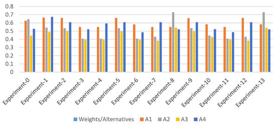 The sensitivity analysis is determined for the closeness of every factor. The sensitivity analysis was calculated to reduce the complexity of the outcome values. The sensitivity analysis [] is obtainable in Table 7. The sensitivity analyses calculate the precise weight of the factors in the security durability of the software in the quantum computing era. The sensitivity analysis is confirmed by numerous analyses of each factor; the various trials show the various outcomes, as seen in Table 7; its graph is shown in Figure 3. Further, from the sensitivity analysis, the closeness coefficients were determined, and the satisfaction degree was evaluated. The calculated weight of every factor (F1 to F4 taken as a consistent at level 1, with further sublevels having factors in level 2) was determined, and by the hybrid procedure of FAHP and FTOPSIS, we evaluated the satisfaction degree.