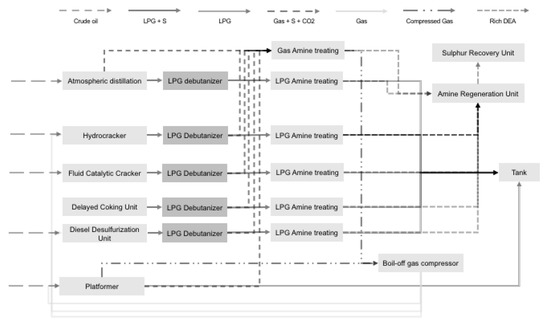 The use case corresponds to a Tüpras refinery located in Izmit, which began oil production in 1961 and currently has a design capacity to process 11.3 million tons of crude oil per year. The crude oil is supplied from four countries: Iran, Iraq, Russia, and Saudi Arabia. Each of these crude oil feedstocks have different characteristics such as density, sulfur content, and impurities. The refinery complies with Euro 5 standards [67] and produces mostly diesel, gasoline, and LPG. The entire refining unit consists of atmospheric and vacuum distillation units, hydrocrackers, fluid catalytic crackers, continuous catalyst regeneration reformers, diesel and kerosene desulphurization units, merox, asphalt units, and sulfur recovery units. In Figure 1, we provide a diagram showing the relation between processing units of this refinery, highlighting the LPG and gas flows. In this research, we focus on the LPG debutanizer units, which is implemented for the atmospheric distillation process. Although feedstock changes regularly, experts pointed out that they do not display much difference in light hydrocarbons content regardless of the crude oil provenance. The atmospheric distillation process ameliorates this difference before the LPG enters the debutanizer unit. Given that the concentration of pentanes does not depend on the crude oil provenance, we consider it as a specific function of the debutanization process which is a distillation process with two control variables: pressure and temperature.