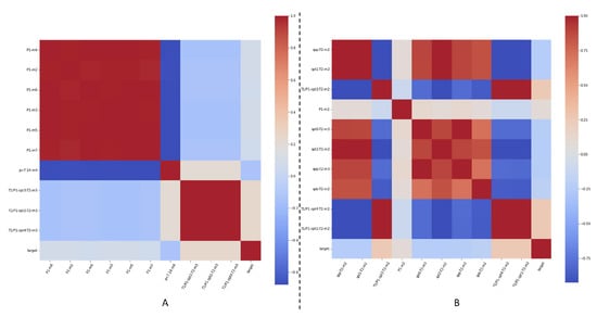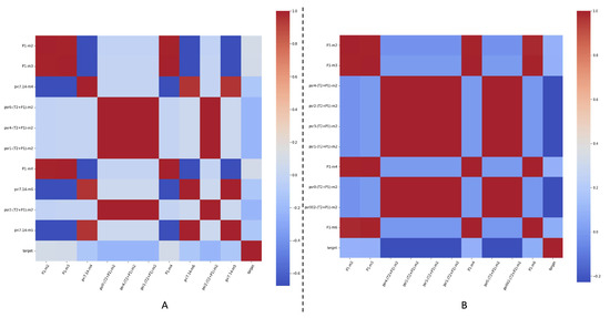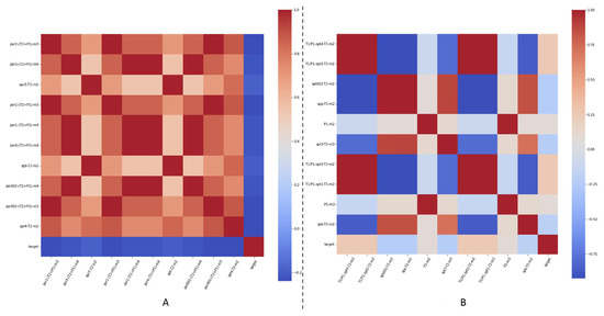 Feature correlation for ten selected features in each case, when forecasting the amount of C5 present in distilled LPG at the end of the distillation process in the debutanizer columns, for Unit B. On (A) we present feature correlations for Experiment 1, while on (B) we present feature correlations for Experiment 2.