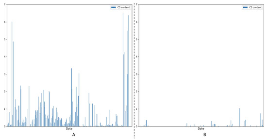 Measured C5 content in laboratory samples over time. Please notice that the samples are taken at irregular intervals. On (A) we present measurements from Unit A, while on (B) we present measurements from Unit B.