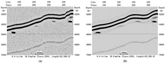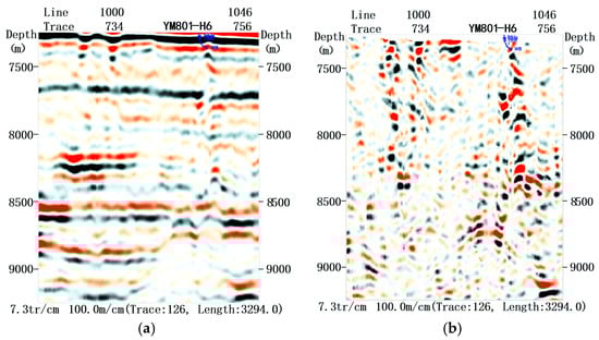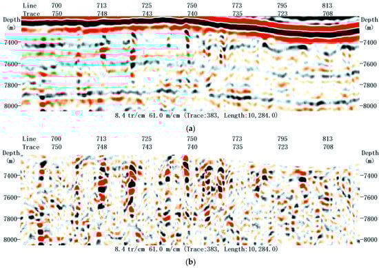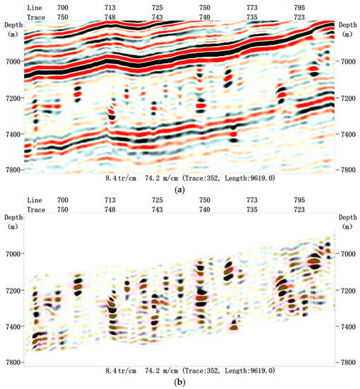 23]. Therefore, the part deducting the seismic wave characteristics of the surrounding rock from the seismic data information was the seismic wave characteristics of the reservoir. The basic strategy is the original seismic data minus the structural dip to guide the laterally filtered data (Equation (4) or Equation (6)), which can keep the apparent phase of the heterogeneous attribute data volume consistent with the phase of the original seismic data. For this reason, the difference between the data after the structural dip guide filtering and the original seismic data is obtained to obtain a data volume of heterogeneous attributes (Equation (7)).