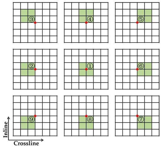 Even if this similarity surface is interpolated, the analysis window may inadvertently span a fault that divides the reflective layer into two regions with different inclination angles. In order to obtain an improved vector inclination estimated value, the multi-analysis window structure is used [