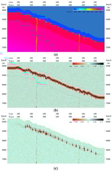 Figure 3a). The filling speed of the formation in the model varies uniformly from top to bottom as 4300 m/s, 4800 m/s, 4500 m/s, 5500 m/s, 5750 m/s~6000 m/s. The formation velocity of the geologic bodies in the model is filled randomly. Between 4600 m/s–5800 m/s, the speckled geologic bodies have the same shape, and the vertical and horizontal dimensions of the striped geological bodies are different.