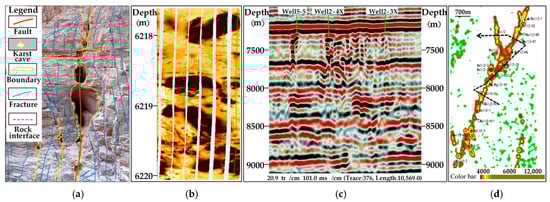 36], and jointly identify fracture tunnel bodies with seismic data. Unfortunately, the distance between wells in the investigation area is mostly one kilometer to five kilometers, or greater. There is no more micro-seismic data for the identification of fracture cavity bodies. Separation of characteristics of SSFCRs and reflection characteristics of stratum structure through interpretative processing methods, such as stratigraphic structure suppression and fault-solution morphological feature enhancement processing, shot domain pre-stack frequency division, and spectrum continuation [