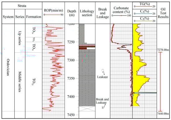 Taking the SHB-YM area as an example, one of the design purposes of the YM801-H6 well in the block is to drill the weak reflection controlled by the fractured zone. After entering the target formation, the vertical fracture zone is designed to drill horizontally along the formation. During the drilling of the well, 7327.50 m encountered drilling fluid loss, and the interval of 7433.09–7278.00 m encountered drilling tool venting. Subsequently, it was transferred to oil and gas test production operations, and perforation tests were carried out in the open hole section of 7278.00–7440.00 m, and finally high-yield industrial oil gas flow was obtained (