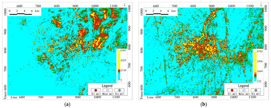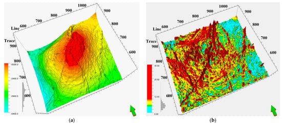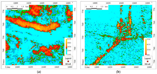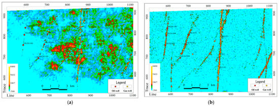 Figure 9a). In the results of the conventional seismic profile and attribute plane, the characteristics of a developed fault zone can only be vaguely displayed. The characteristics of weak anomalies are disturbed by the flake’s strong reflection background in the South and North. The wave group anomalies caused by these heterogeneous reservoirs are submerged in the background. This makes it impossible to effectively identify the characteristics of the FVRs.