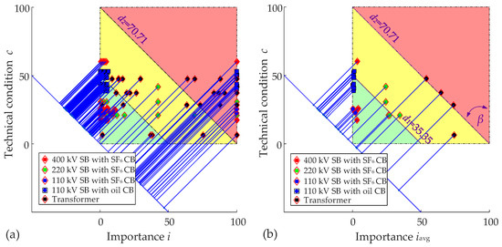 Figure 2a shows the c − i diagram with the condition of all elements in all significant states of the index ijq, while Figure 2b shows the c − iavg diagram with the average index of the element iq. In comparison to the diagram in Figure 2a, the diagram in Figure 2b shows only one point on the c − i diagram for the TS elements. d1 and d2 are bounds between the areas of action and are defined by the TSO. These areas represent risk of failures on devices.