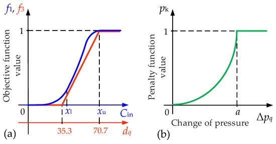 (a) Presentation of normalization of the objective functions f1 (expected costs of outages) and f3 (c-i indices); (b) presentation of normalizing of the penalty function pk (leaking of SF6).