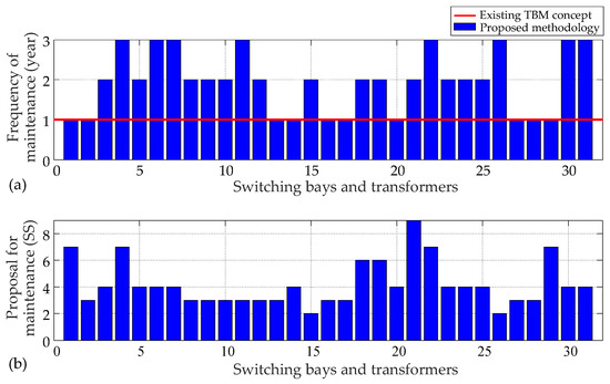 Figure 6 shows the results of optimal maintenance for the observed TS, where Figure 6a shows the optimization parameters from the vector pr,OPT (in years) for the revision performed in each individual switching bay or power transformers (the existing TBM maintenance methodology—red line, proposed optimal methodology—blue histogram). Figure 6b shows the optimal data of the second set of optimization parameters pSS,OPT, which represents the proposal for maintenance. It provides the information about the selected SS of the EPS (possible future combination of generation, consumption, and power flows in the TS) when it would be most suitable to de-energize the TS elements and perform revision.