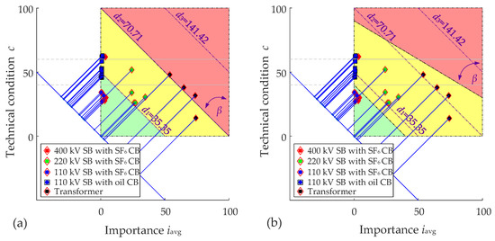 The optimization results of RCM maintenance methodology are presented in the c − iavg diagrams in Figure 8. The c − iavg diagram after the optimization (Figure 8a) was compared with the c − iavg diagram before optimization (Figure 2b). The comparison of both c − iavg diagrams showed that the points only moved vertically. Differences between the values of technical condition index c before and after the optimization for individual switching bays ranged between 0 and 18.