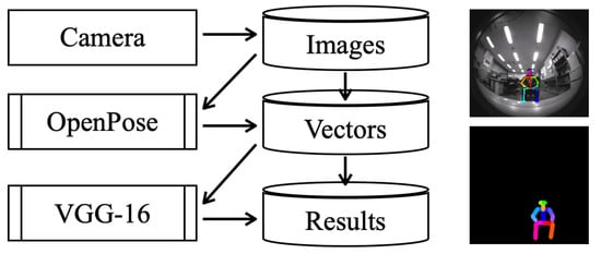 The second step uses OpenPose [190] to extract feature vectors of pose motions. Herein, human two-dimensional (2D) pose estimation represents a challenging task for computer vision studies. Numerous methods [191,192,193,194,195,196,197,198,199] have been proposed to detect 2D poses from multiple people in a single image. Based on an earlier study reported by Noori et al. [200], we used OpenPose [190] because of its simple and easy implementation, high-speed processing, and high estimation accuracy. Regarding the accuracy verification of OpenPose, Kim et al. [201] employed 17 inertial sensors to evaluate 12 motion tasks: upright standing, trunk flexion 30, sitting on a stool trunk flexed and rotated, placing an object on top, kneeling above the head, arms crossed, holding a box, legs crossed, sitting at the desk, simple lifting, and complex lifting.