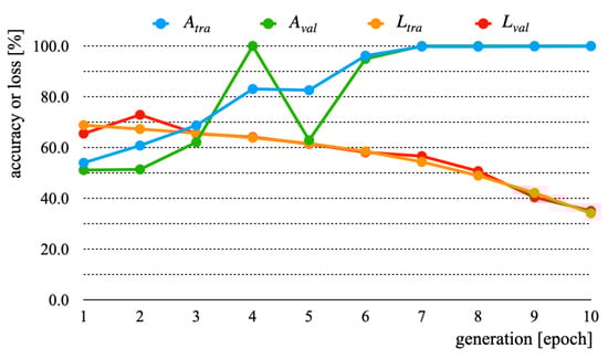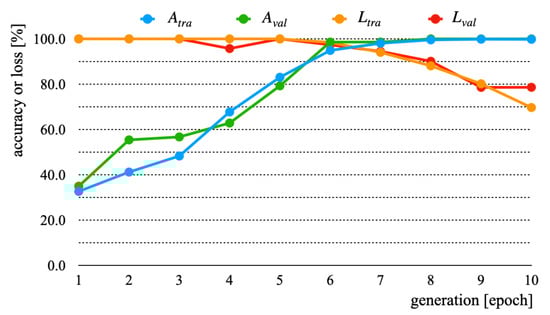 Table 3 presents the major parameters of VGG-16. Based on our earlier study [212], the number of generations, batch size, and validation split were set, respectively, to 50 epochs, 4, and 0.2. The number of the input layer corresponds to the resized image size: 224 pixels × 224 pixels × 3 channels. The numbers of the output layer were set to two, three, and five, according to the number of target categories. For the optimization algorithm, we used Adam [213], which is an optimizer combined with Momentum [214] and RMSProp [215].