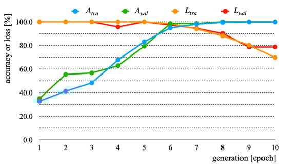 Figure 4 presents transitions of , , , and in 10 epochs. Both and increased steadily. The values of and decreased, respectively, from the sixth epoch and the fourth epoch. After increasing in the fifth epoch, it decreased from the sixth epoch.