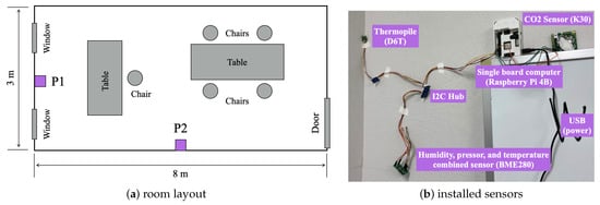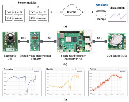 For the second approach, we aimed at developing a privacy-aware sensor system. Figure 6a depicts the overall configuration of our second proposed system. We selected five environmental sensors that measure air and temperature distributions. A single-board computer (SBC), Raspberry Pi 4 Model B, was used to save measurement signals to a flash memory device. This SBC is a commonly and widely used prototyping device available for scientific research and industrial application development [217]. Measurement signals obtained from two independent sensor modules are sent to an IoT cloud service called Ambient (AmbientData Inc.; Tokyo, Japan) for storage and visualization. The data-receiving interval of this free service is 1 min.