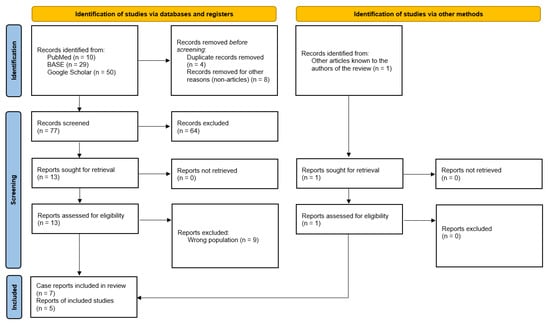 The course of article selection in the form of a PRISMA flow diagram is shown in Figure 1 [5]. In total, 27 unique records found in the PubMed and BASE studies, along with the decisions for qualification at the screening stage, are included in Supplementary S3 (agreement: 96.3%; Cohen’s k = 0.78). Supplementary S4 contains a list of articles found using the Google engine along with the consistent decisions about their qualification at the screening stage.