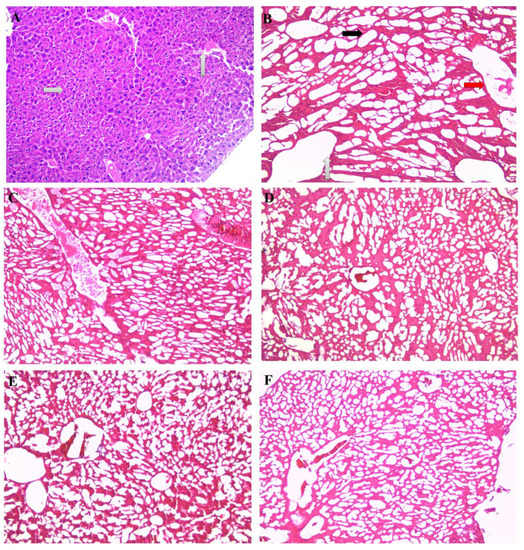 Histopathological analysis of mice liver stained by H&E staining. (A) Normal mice liver, (B) DEN + CCl4-treated mice liver, (C) BLE treatment at a low dose of 60 mg/kg of mice b.wt, (D) BLE treatment at a high dose of 120 mg/kg of mice b.wt, (E) berberine compound at a low dose of 60 mg/kg of mice b.wt, (F) berberine compound at a high dose of 120 mg/kg of mice b.wt. Arrows in A indicate the normal hepatocyte phenotype and sinusoid spaces among hepatocytes. In B red arrow indicates the appearance of small tumors along with infiltration of inflammatory cells, black arrow indicates ballooning of hepatocytes and white arrow indicates necrosis in the centrilobular zone. Scalebar 100×.