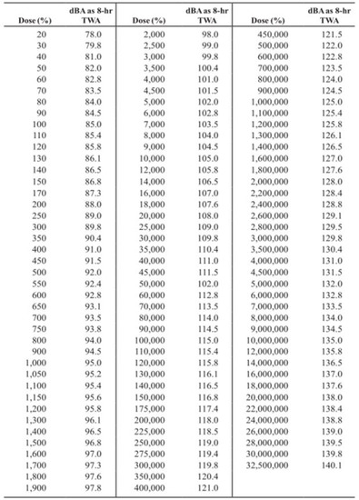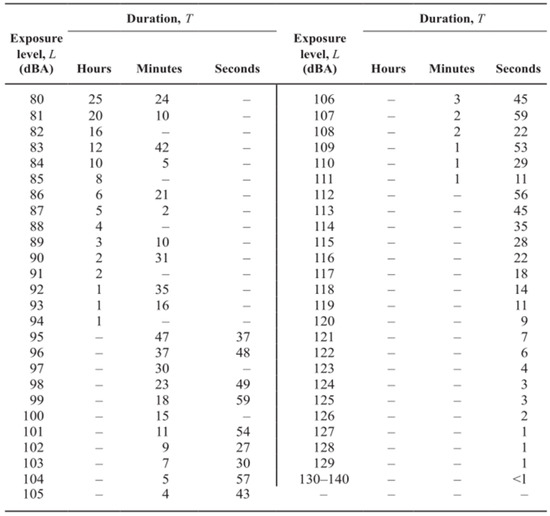 According to Equation (1), the exchange rate is 3. In other words, when the noise increases by 3 dB, the duration is halved [7]. Considering that daily noise exposure consists of periods of different noise levels, this can be calculated as follows: