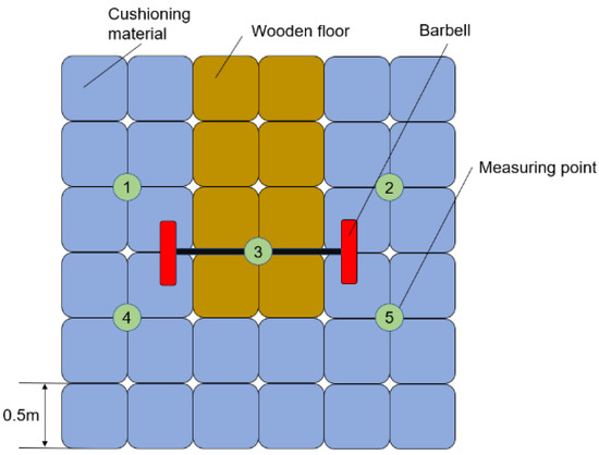 According to several field surveys in the gyms, the most common exercises in the barbell weightlifting area are the squat and deadlift. Because of the difference in the targeted muscle groups, the clean and jerk and the snatch often involve the heaviest weights among exercises. In addition, these two exercises most likely involve the dropping of heavy objects accidentally or intentionally in the fitness center. Although the usage rate of Olympic weightlifting exercises is relatively low in a normal gym, these activities could involve dropping the weight to the floor from a higher position. Therefore, the squat, deadlift, snatch, and clean and jerk (mentioned in Table 1) were selected as the main test exercises.