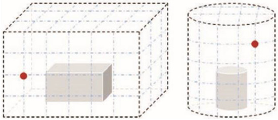 Figure 3 shows an enlarged version of the test area floor plan. Each lifting area was approximately 3 m × 3 m with two different floor finishings. The proposed locations of the testing devices are indicated by the green dots. The position of devices remained constant between tests to maintain consistency. According to ISO 9614-1 and ISO 6926, the distance interval between every device should be greater than 0.5 m. Figure 4, provided by SIEMENS [9], demonstrates a model for operators to place the sound level meters around a source, which can yield a sound power contour. In this study, the goal was to understand the noise level map generated by the heavy gym activities. The exact value of noise level at various locations (e.g., at various ear levels) can be determined on the basis of the physics of noises but is beyond the scope of this study. In this study, A filters were adopted for consideration. Measurements made on A filters are expressed in dBA. The dBA sound level meter applies to mid-range frequencies, as opposed to the dBC sound level meter that measures low and high frequencies. In general, the Occupational Safety and Health Administration provides the guidelines regarding workplace noise exposure limitations based on dBA measurements [5].