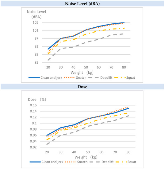 It can be seen from Figure 5 and Figure 6 that, although the change trends of noise and dose of the four activities were basically the same, there were still high and low levels. The blue and red lines (representing the clean and jerk and the snatch, respectively) were very close in terms of both change trend and numerical value, always being at the highest level. They were followed by the squat (yellow line), with the noise level ranging from 90 to 100 dBA. The gray line (deadlift) was the lowest among the four lines, with the noise level remaining below 100 dBA.