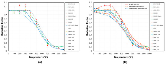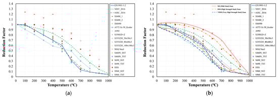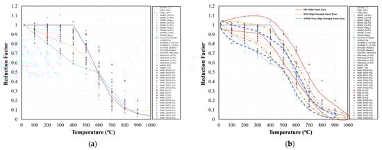 The tensile strength (ultimate strength) reduction factor: (a) different steels at elevated temperatures from previous studies; (b) according to the steel grade, highlighting the MS, HSS, and VHSS zones.