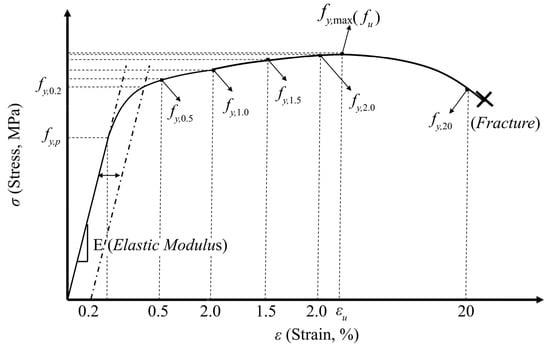 Most tests have reported that the mechanical properties are different from those of conventional carbon steels [24,25]. Moreover, the mechanical properties are mentioned in the MOP Sec.8.2.1.2, ASCE MOP 138 in terms of stress–strain relationships for structural steel at elevated temperatures [1]. It is mentioned that the most important mechanical properties of structural steel all decrease as the temperature increases. Nevertheless, it is not mentioned whether the types of structural steel are mild steel or high-strength steel.