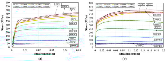 After testing the ASTM A572 Gr. 50 steel, the stress–strain curves at each target temperature were summarized, as shown in Figure 6. Figure 6a shows the stress–strain curve up to the initial 0.05 (5%) strain level. Using the stress–strain curve at the initial strain level, the diagram of the steel in the elastic section can be carefully observed. Figure 6b shows the stress–strain curve up to the 0.2 (20%) strain level. In general, it is common to obtain the strain of steel for design purposes of up to 20%; in this study, the range of the maximum strain was expanded to 20%. Based on the stress–strain curve of Gr. 50 steel for each target temperature, the difference in the stress according to the temperature was not large up to 300 °C, but the stress rapidly decreased above 400 °C. Above 400 °C, the strength of the steel material decreased significantly, while the difference in the room-temperature strength increased with an increase in the strain level. Overall, when the strain level of the maximum stress (tensile strength, ) is reached, the stress gradually decreases with an increase in the strain. At 800 °C or higher, even if the initial stress was low, the steel did not break, with a continuous increase in the strain of the steel material. The stress–strain curve for Gr. 50 steel is important for applications of the strength reduction factor according to the strain level in the fireproof design of steel structures.