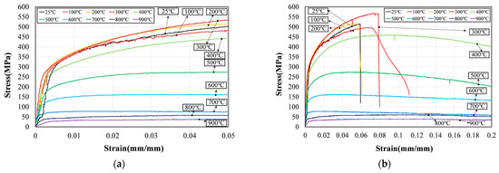 After the test for the ASTM A572 Gr. 60 steel, the stress–strain curves at each target temperature were summarized, as shown in Figure 7. Figure 7a shows the stress–strain curve up to the initial 0.05 (5%) strain level. The stress was measured at temperatures higher than the room-temperature strength due to temperature hardening from 200 to 300 °C. Gr. 60 steels in the room temperature to 300 °C range were more likely to fail at lower strains (6–8%) than steels at other target temperatures due to their brittle behavior, as shown in Figure 7b. However, this type of steel exhibited ductile behavior at a target temperature of 400 °C or higher, with an increase in elongation and the occurrence of ductile fracture. Above 700 °C, the strain increased at low stress, as shown in Figure 7b, for Gr. 60 steel. At 1000 °C, the deformation of the steel material increased rapidly when the high-temperature extensometer exceeded the limit of the measuring range.