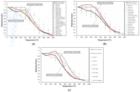 Comparison of the reduction factors for the yield strength with the literature values and standards at various strain levels: (a) 0.2% (using the 0.2% offset method); (b) 0.5%; (c) 20%.
