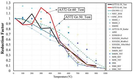 The tensile strength reduction factors from the literature (Table 2) and ASTM A572 Gr. 50 and 60 were compared, as shown in Figure 10. In the Eurocode and AISC standards, the tensile strength at the target temperature was divided by the yield strength at room temperature and expressed as a yield ratio. However, in this study, the tensile strength reduction factor was obtained by dividing the tensile strength at the target temperature by the tensile strength at room temperature . To compare the tensile strength reduction factor based on an equal normalization, the literature values (Table 2) or codes presenting yield ratios were changed to the tensile strength ratio .