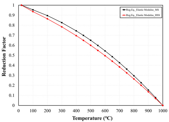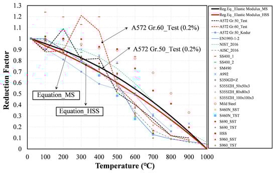 - The differences in the elastic modulus reduction factor of the Eurocode and AISC to MS are 30% and 26%, respectively. However, the elastic modulus factors of the NIST are in good agreement under 5% based on the experimental works for both MS and HS. In the case of the elastic modulus reduction factor for the HSS, the decrement difference was approximately 25% from the one of Eurocode. As with the yield strength results, the proposed elastic modulus Equations (7) and (8) were close to the ones of the NIST compared to Eurocode or AISC.
