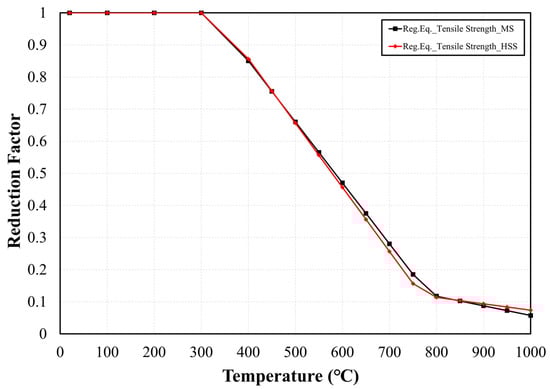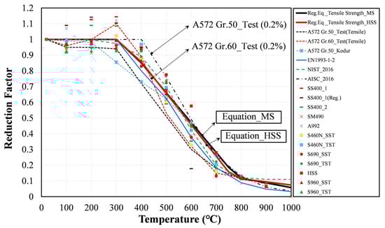 Figure 13 shows the proposed equation for the tensile strength reduction of MS and HSS. The difference in the tensile strength reduction factor was not significant, regardless of the steel grade. As the tensile strength shows the greatest strength in the stress–strain curve, there is no difference depending on the strain level. The tensile strength reduction factor for MS is summarized by Equations (9)–(11), while that for HSS is expressed in Equations (12)–(14). The difference between the reduction factors of MS and HSS is not large, such that it is not necessary to divide them into regression equations. However, if a specific fire design is required above 500 °C, the equations can be applied separately.