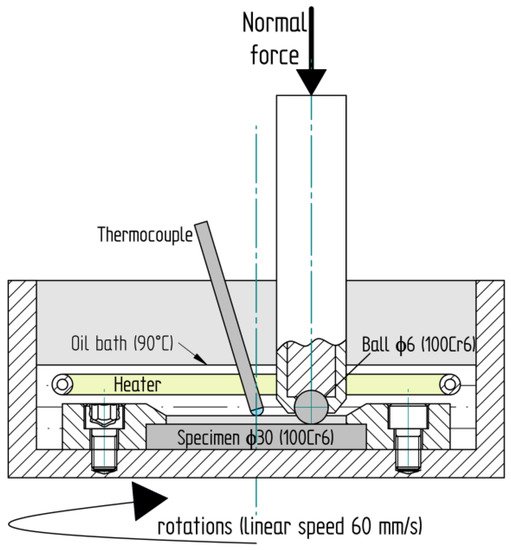 Lubrication tests were conducted on the CSM microtribometer (CSM Switzerland). The tests were performed using a ball-on-disk module, such as the one shown in Figure 1. A steel friction node was installed. Both elements of the friction pair were made of 100Cr6 steel. Friction tests were conducted in an oil bath at 90 °C, which supposedly corresponded to the operating temperature of the oil in real working conditions. The load in the friction test was constant and equaled 5 N. The sliding distance was 630 m, and the linear speed was 60 mm/s. During the friction tests, the friction coefficient was recorded at the frequency of 10 Hz as a function of the friction path.