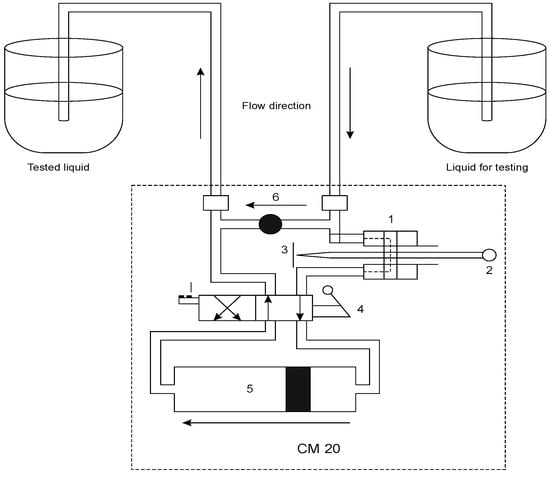 Diagram of the measuring system, 1—measuring chamber, 2—laser light source, 3—optical scanner, 4—switching valve (hydraulic), 5—dosing pump, 6—flow sensor.