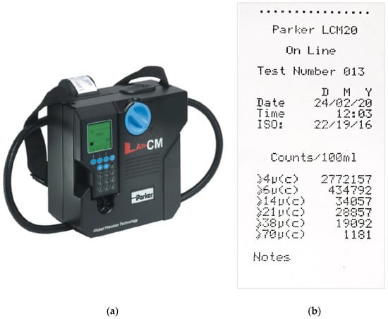 The measurement accuracy of this type of transmitter is an important issue. It should be noted that a quality of measurements better than 5% was obtained when the ISO MTD (ISO Medium Test Dust) and ISO ACFTD (ISO Air Cleaner Fine Test Dust) procedures were used. As a result, it is possible to obtain results that are in accordance with the ISO standard and that are in the range of 7–22 µm; NAS and SAE measurements were also obtained in the ranges of 0–12 µm and 0–12 µm, respectively. In the conducted research, it was assumed that the contaminants would be classified into six sections: 4; 6; 14; 21; 38; and 70 µm. Figure 3 shows the measuring device and an exemplary printout of the measurement results.