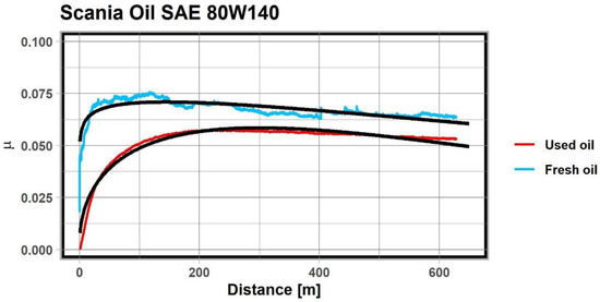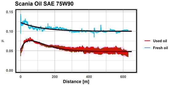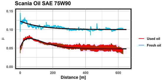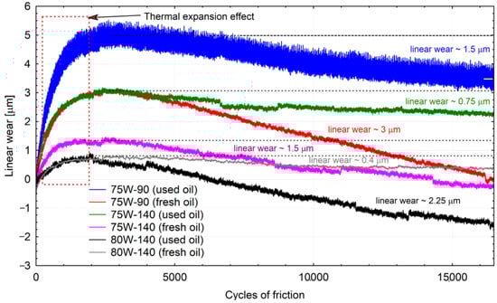In the literature, the stage at which the curve of the friction coefficient is constant is called stationary or normal [26]. The stability of the friction process is important when assessing oils. However, the lubricity of the oils that were tested is of practical significance. The SAE (Society of Automotive Engineers) defines lubricity as a measure of the difference in friction when comparing the properties of different oils with the same viscosities under the same conditions [27]. In the results from the tests that were conducted in the current research, the nominal viscosities of the fresh oil and used oils were the same, as the assumed mileages (km) were not exceeded. Three different oils were tested in these tests. When comparing the gear oils with different SAE viscosity classes, the following definition of lubricity proposed in [28] may be relevant: lubricity is the liquid’s ability to cause low static resistance when moving solid surfaces and high resistance when bringing them together under a normal load. According to [29], lubricity is the ability of a substance to provide better lubricating properties in conditions where the lubricant film is so thin that its action is not only determined by viscosity. This is probably related to the occurrence of mixed friction in many steel friction nodes. The approach presented in these works is utilitarian, and the value of the friction coefficient is of practical importance when assessing oils. According to the criterion for assessing the condition of oil, i.e., lubricity, the condition of these oils can be considered suitable for use with high probability. A similar relationship was demonstrated for engine oils composed of mineral oils that were used in heavy trucks [30,31]. After 350,000 km, the used oil demonstrated a friction coefficient that was slightly higher than that of the average value of the friction coefficient that was obtained for fresh oil, and the standard deviation of the used oil’s friction coefficient was clearly lower. The results indicate that the used oil 75W-140, which performed greater operational work than oils 80W-140 and 75W-90, had worse lubrication properties and was closer to reaching the limit state. It is worth adding that in [32], the limit state of the object is defined as a technical condition in which further operation of the object is not recommended. It should be kept in mind that the quality of a product is determined by its degree of compliance with requirements [30], and the technically justified service life of oil should ensure the maximum use of the potential of oil quality [33]; if this is true, then used oil 75W-140 should not be considered to be suitable for use. Such a performance of this oil is also confirmed by the linear wear results that are presented in Figure 7 (the curve marked in blue). The highest difference in average values of the friction coefficient for the fresh and used oil was found for the oil with the lowest nominal viscosity of 75W-90. The difference was ~37%. The same relationship was also shown in the linear wear measurements. In addition, the average friction coefficient for fresh oil 75W-90 was the highest among all of the tested oils. The linear wear fresh oil 75W-90 was also the highest of all of the fresh oils. It is possible that the condition of the used oil 75W-90 also depended on the type of a gearbox that the oil was worked in. The two other oils worked in axles. Bevel gearboxes are used in the rear axles, and this type of gearbox is characterized as having a much greater degree of slipping compared to hypoid gear boxes, which means that the working conditions of the oil in the axles are more demanding [19]. A different extortion spectrum may be reflected in the dimension of the qualitative changes that were observed in the oils used in axles.