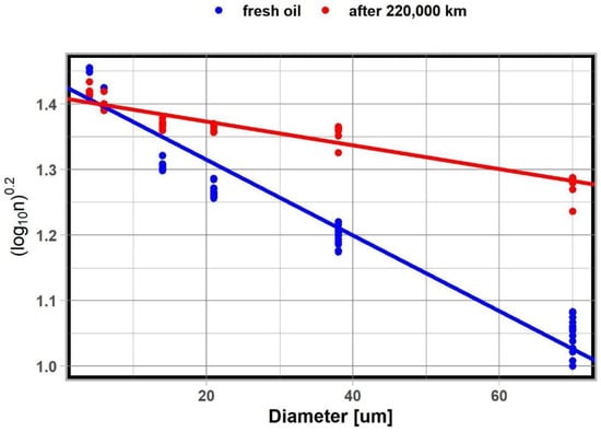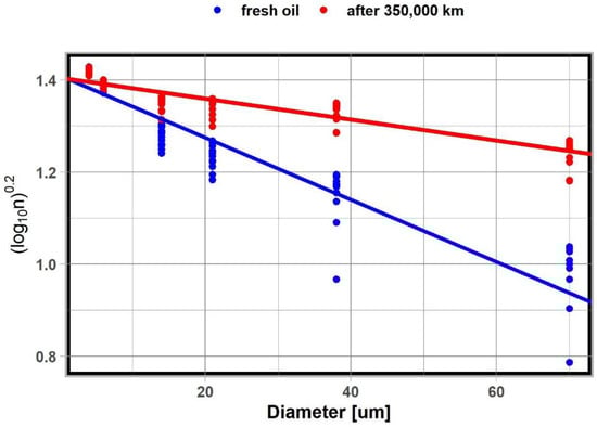 The analysis also concerned the impact of the degree of contamination on lubricating properties. An analysis of the relationship between the number of particles and the diameter was conducted. The purpose of this analysis was to identify and compare the trends that were obtained for the fresh and used oils. For each of the oil states (clean and used), the relationship between (logarithm of the decimal number of particles depending on the diameter of x) was identified. For this purpose, a linear model with a particular transformation of the dependent variable was considered as follows: