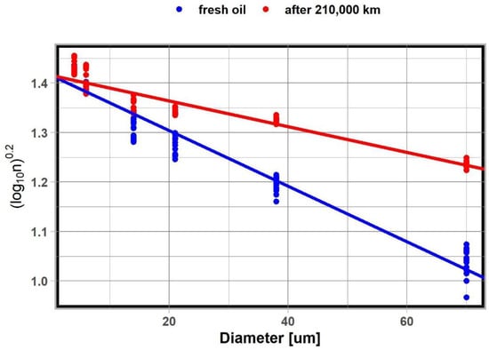 Regression model of particle content as a function of particle diameter of fresh and used (350,000 km) gear oil SAE 75W-140.