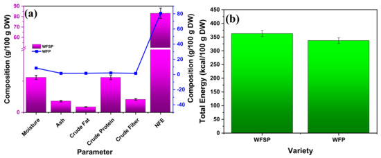 Figure 1a,b summarise the proximate composition of both WFSP and WFS. The results of Figure 1a show that WFSP presented the maximum moisture of 5.57 ± 0.22, ash of 1.79 ± 0.28, crude fat of 0.86 ± 0.41, crude protein of 5.56 ± 0.99, and crude fibre of 2.06 ± 0.17 and nitrogen-free extract (NFE) of 83.17 ± 0.98 g/100 g DW, while WFP exhibited the highest moisture of 8.50 ± 1.01, ash of 1.53 ± 0.04, crude fat of 1.62 ± 0.02, crude protein of 2.06 ± 0.06, and crude fibre of 1.49 ± 0.02 and nitrogen-free extract (NFE) of 80.71 ± 0.91 g/100 g DW. Figure 1b reveals that WFSP and WFP exhibited the total energy of 362.73 ± 2.49 and 337.21 ± 2.15 kcal/100 g DW, respectively. Overall, it was observed that moisture and crude fat content were higher in WFP, while ash, crude protein, crude fibre, NFE, and total energy were higher in WFSP. The results were significant (p ˂ 0.05) based on the Tukey HSD test. Our results are in co-relation with the findings of previously published data. Alam et al. [34] stated that the BARI SP4 Bangladesh variety of orange-fleshed sweet potato (OFSP) showed the highest moisture, protein, fat, crude fibre, ash, and carbohydrate content of about 70.95 ± 0.70, 5.83 ± 0.30, 0.30 ± 0.25, 0.54 ± 0.14, 1.29 ± 0.06 and 21.10 ± 0.93 g/100 g of FW, respectively. Similarly, Omoba et al. [28] demonstrated that UMUSPO1 and UMUSPO2 varieties of Nigerian, orange-fleshed sweet potato showed the maximum moisture content of 85.12 ± 0.08 and 84.71 ± 0.05 g/100 g DW, ash content of 15.49 ± 0.06 and 12.71 ± 0.01 g/100 g DW, the crude fibre content of 4.50 ± 0.02 and 4.90 ± 0.03 g/100 g DW, the protein content of 30.07 ± 0.09 and 25.00 ± 0.08 g/100 g DW, fat content of 1.44 ± 0.06 and 1.74 ± 0.04 g/100 g DW, and total energy value of 327.24 ± 0.05 and 338.26 ± 0.07 kcal/100 g, respectively. Kumari and co-workers [35] reported that Lady Rosetta and Lady Claire cultivars of potato peel powder showed the highest crude fat content of 2.09 ± 0.01 and 1.27 ± 0.38%, crude protein content of 11.17 ± 0.03 and 12.44 ± 0.09%, ash content of 7.24 ± 0.02 and 4.83 ± 0.13%, moisture of 6.98 ± 0.05 and 77.38 ± 0.65%, and total carbohydrate of 72.53 ± 0.08 and 77.38 ± 0.65%, respectively.