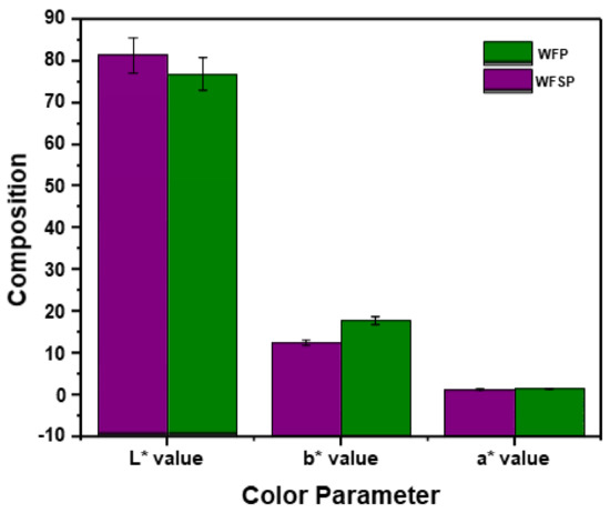Figure 2 shows the results of colour analysis of WFSP and WFP. It was observed that WFSP and WFP showed the maximum L* (lightness) value of 81.29 ± 0.41 and 76.85 ± 0.08, respectively. Similarly, the b* (yellowness) value of 12.48 ± 0.08 and 17.84 ± 0.05 was noted for WFSP and WFP, followed by an a* (redness) value of 1.47 ± 0.08 and 1.66 ± 0.38, respectively. The results showed that the lightness (L*) value was prominent in both samples (i.e., WFSP and WFP), while WFSP presented the best results compared to WFP regarding lightness. In contrast, WFP showed the highest yellowness colour compared to WFSP. Our results are in agreement with the findings of Kourouma et al. [36]. They experimented on twenty-five different varieties of Chinese-cultivated sweet potatoes and revealed that Xinxiang, Mixuan No.1, Nongdabai, Zheshu 75 and Jishu No. 7 varieties showed a flesh colour of yellow-white, while Qinshu No. 7, XS 15-11-15, Yanshu 25, Sushu 16, Xiangshu 2, Yizi 138, Longshu 515 and Zheshu 13 varieties showed a yellow-orange colour, respectively.