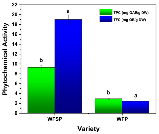 The total flavonoids content (TFC) and total phenolic content (TPC) of WFSP and WFP. Different letters in the column represent the significant difference based on the Tukey HSD test (a = p ≤ 0.05, b = p ≤ 0.01).