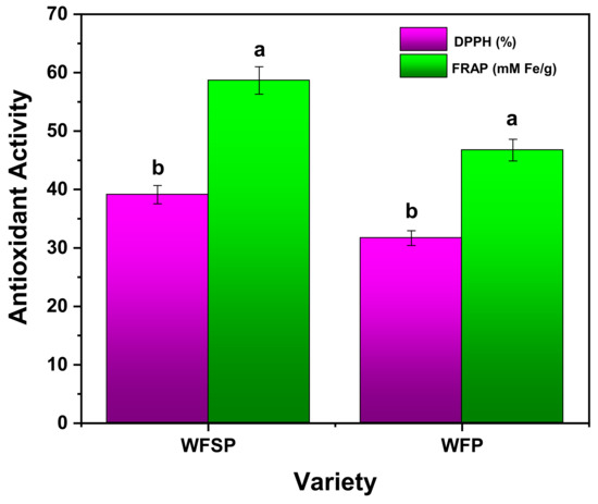 Ferric reducing antioxidant power (FRAP) and antioxidant (DPPH) activities of WFSP and WFP. Different letters in the column represent a significant difference based on the Tukey HSD test (a = p ≤ 0.05, b = p ≤ 0.01).