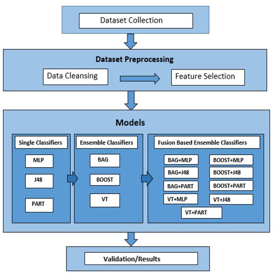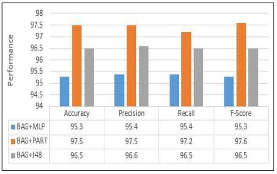 These models include BAG + J48, BAG + MLP, BAG + PART followed by BST + J48, BST + MLP, BST + PART. The last hybrid ensemble-based models were VT + J48, VT + MLP, VT + PART.