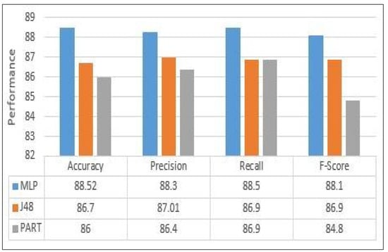 The three base classifiers including MLP, J48, and PART were applied after the data preprocessing stage. The evaluation results showed that among these three base classifiers, MLP outperformed the other classifiers, achieving greater accuracy (i.e., 88.52) as shown in Figure 2. The figure has two parts; in the first part, the bar chart presents the performance of classifiers in terms of accuracy, precision, recall, and F-score. The second part presents the performance of classifiers in tabular form through the same measures. The MLP classifier also performed better in terms of other measures such as precision, recall, and F-score. The time complexity of the MLP classifier is O(emnk), which is a composition of interconnected neurons, whereas J48 and PART have a time complexity of O(mn2), which works on the If and Then rule until the predicted class has not been obtained.