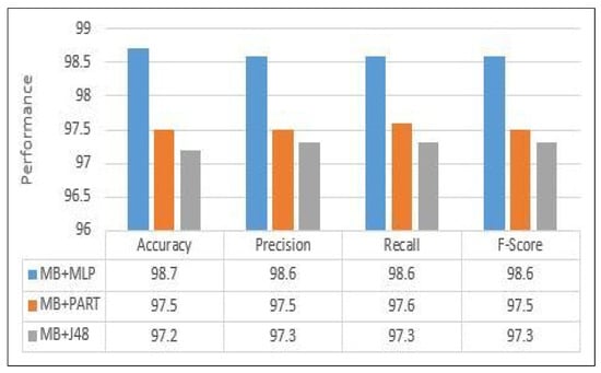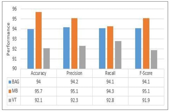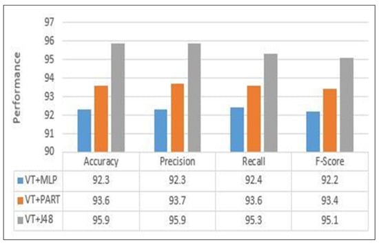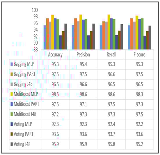 The evaluation results related to BAG fusion with PART showed the highest accuracy (i.e., 97.50%). The model also performed very well with respect to precision, F-score and recall, as shown in Figure 4. The experiment results related to MB fusion with MLP achieved the highest accuracy (i.e., 98.7), as shown in Figure 5. This model has achieved good performance with regard to precision, recall, and F-score. The results related to the fusion of VT with different single classifiers showed that VT + J48 achieved greater accuracy (i.e., 95.9%), as shown in Figure 6. This model also showed better performance in terms of precision, recall, and F-score. Each of Figure 4, Figure 5 and Figure 6 consist of two parts; in the first part, the bar chart presents the performance of classifiers in terms of accuracy, precision, recall, and F-score. The second part shows the performance of classifiers in tabular form through the same measures.